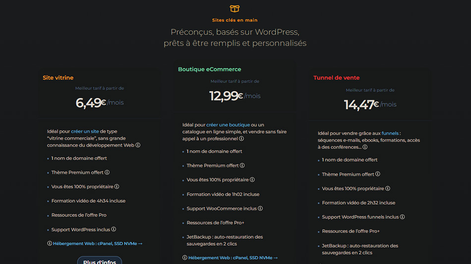 Pour les offres sites clés en main, afin d’offrir un maximum de compatibilité, celles-ci se basent sur WordPress. Vous le savez sûrement déjà, c’est le meilleur CMS et le plus répandu pour bien référencer votre blog. Il sera alors aisé de créer un site professionnel, une boutique en ligne ou un tunnel de vente qui convient à vos besoins. En plus de cela, le fournisseur intègre dans les offres un nom de domaine et un thème premium.